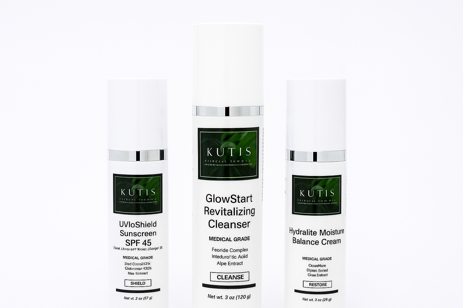 KUTIS Skincare Set with Glowstart Revitalizing Cleanser, Hydralite Moisture Balance Cream, and Uvioshield Sunscreen SPF45